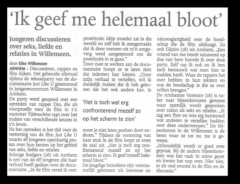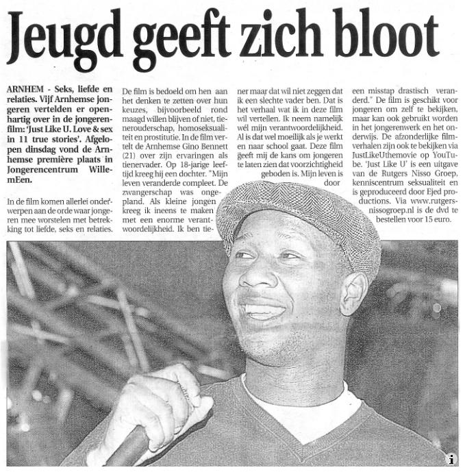 Zo start de film ‘Just Like U. Love & sex in 11 true stories’. In deze film vertellen elf Nederlandse meiden en jongens van Surinaamse, Antilliaanse en Afrikaanse afkomst over hun keuzes in seks, liefde en relaties. Jongeren krijgen vaak alleen maar waarschuwingen te horen over seks, alsof ze vooral risico's lopen en niet stilstaan bij wat ze doen. De thema's die aan de orde komen zijn herkenbaar voor alle jongeren.